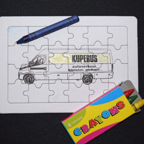 ‘Je kunt niet vroeg genoeg beginnen met klantenbinding’ aldus Kuperus. Bij Kuperus Autoverhuur krijgen alle toekomstige klanten vanaf vandaag een leuk cadeautje mee. Een gave puzzel van onze mooie bestelwagen van 15m3. Deze kan eerst gekleurd worden met bijgeleverde krijtjes en daarna kan er gepuzzeld worden.